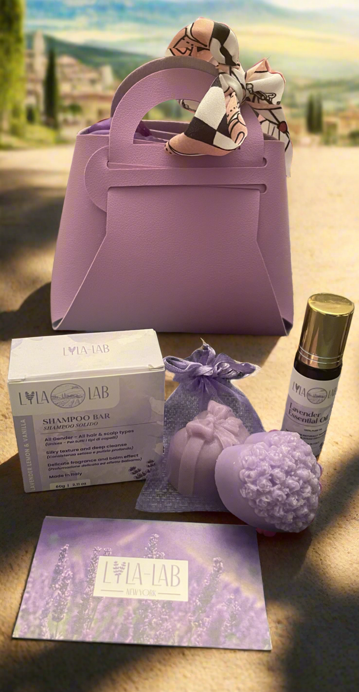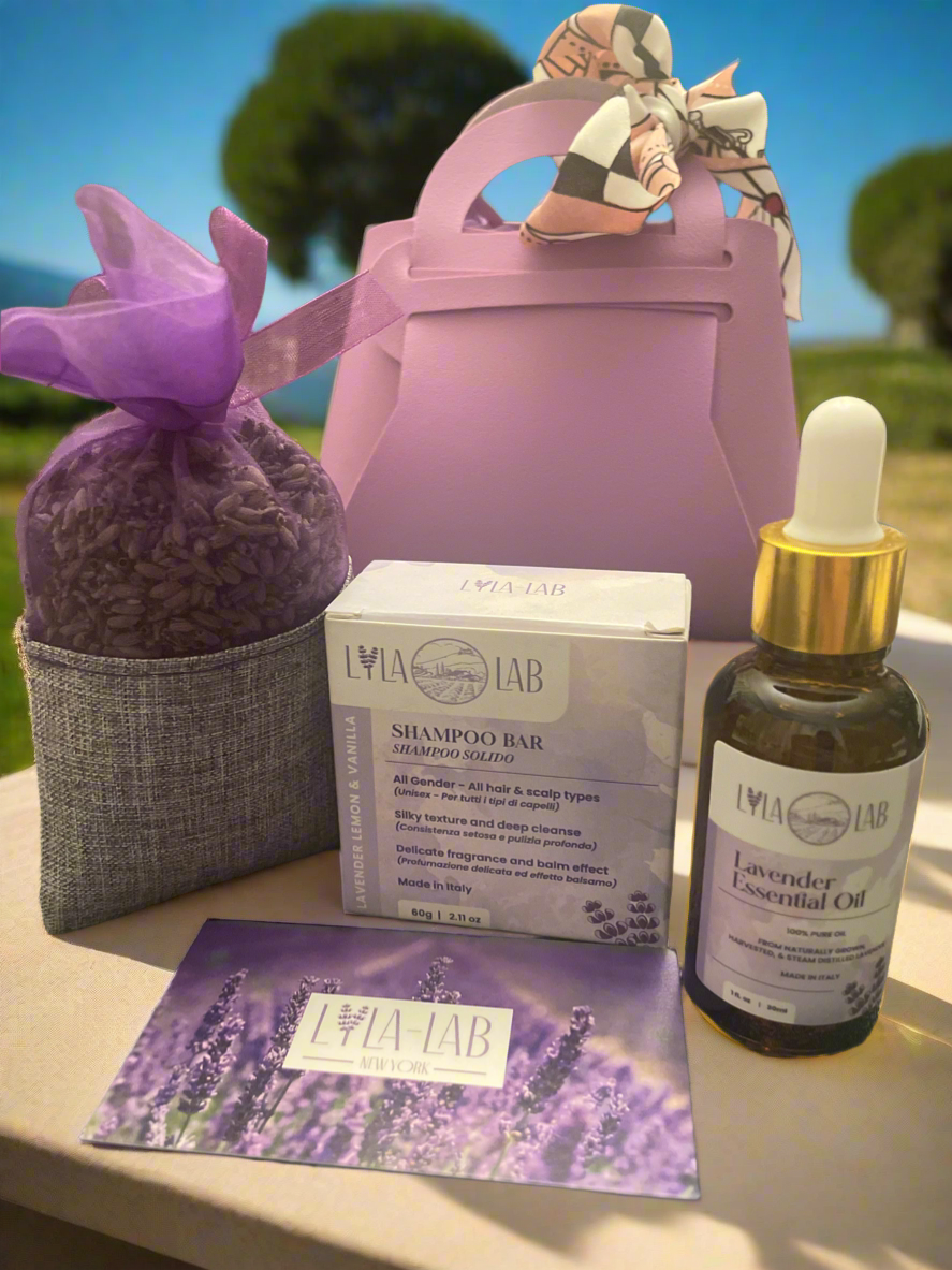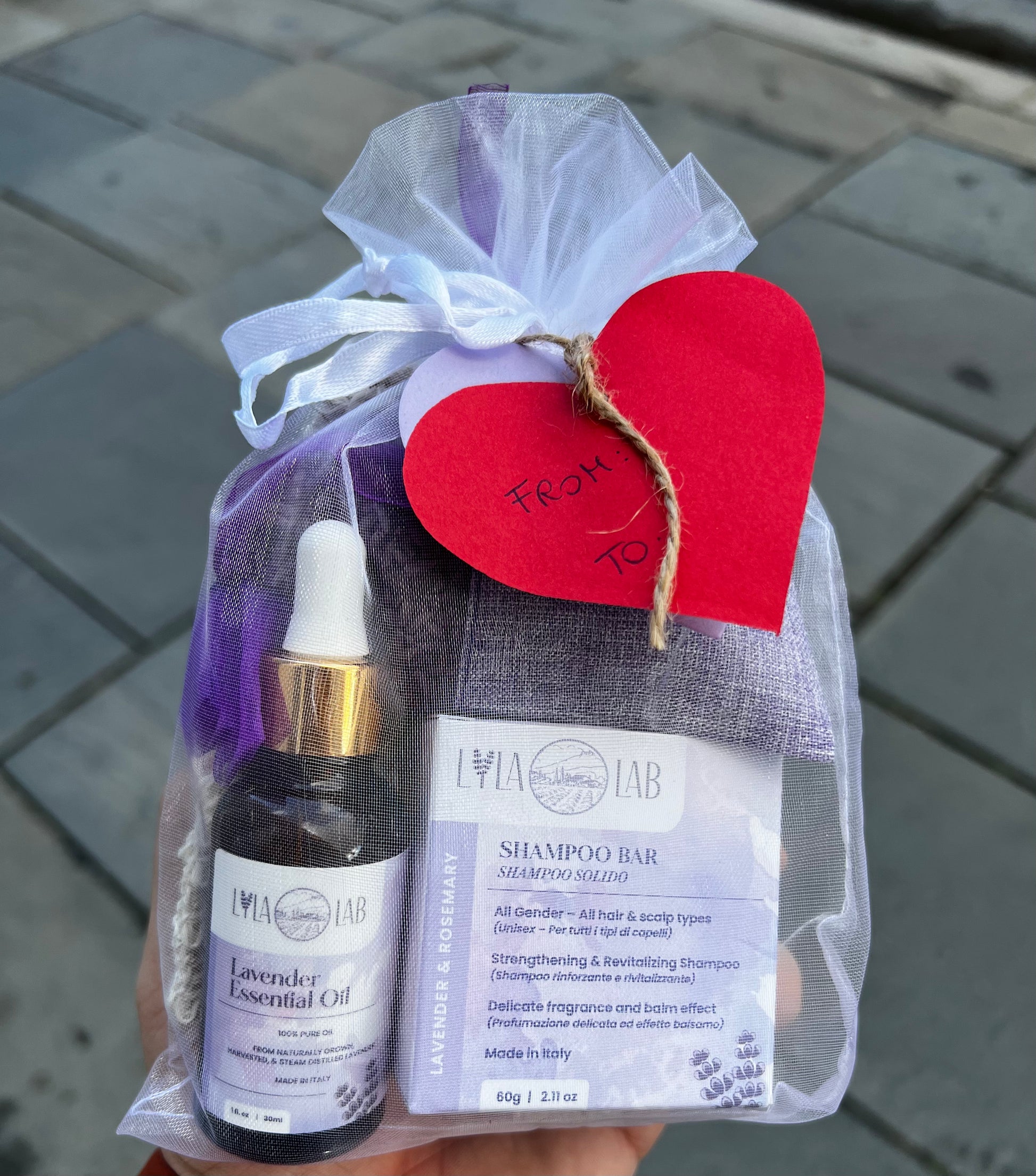 Contained within a beautifully crafted, eco-friendly package, you'll find an array of hand-selected items, each embodying the spirit of love and originality. From the pure essence of relaxation of our Lavender Essential Oil, 100% natural and pure, to the bespoke, all-natural shampoo bar with lavender oil and jasmine fragrance, every item promises to be a delight to your loved one senses.